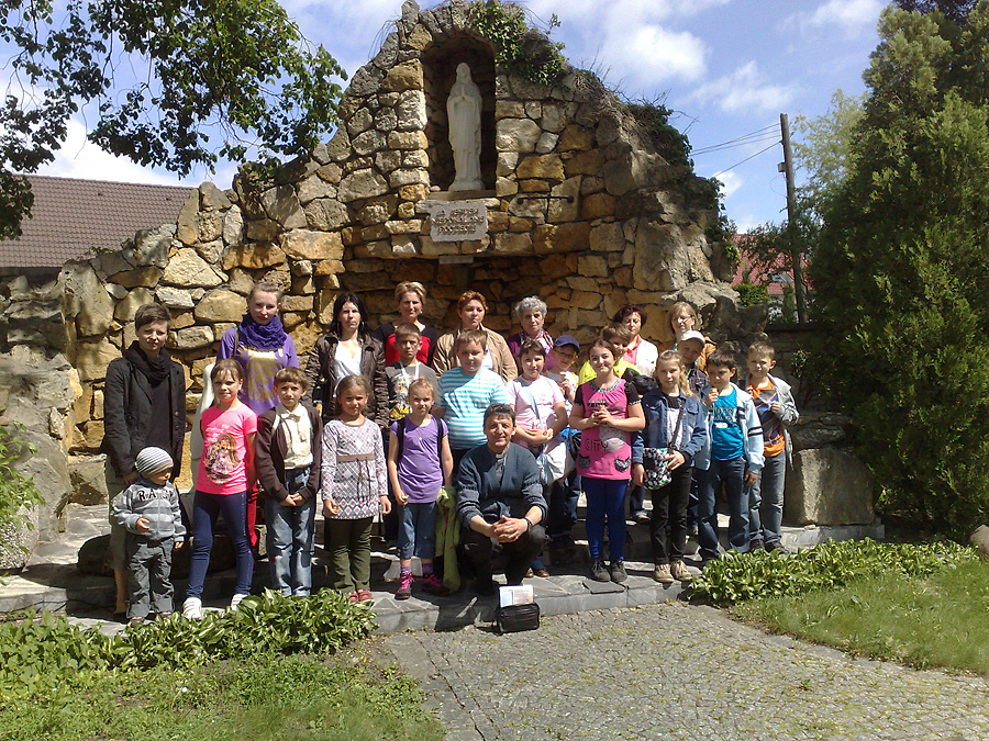 18 maja przeżyliśmy sympatyczną pielgrzymkę dzieci I – wszo komunijnych 2013, ich rodziców, dziadków lub rodzeństwa do Kamienia Śląskiego. Wyjechaliśmy o godz. 9.00 z przed plebanii. Wszytko rozpoczęliśmy modlitwą. Na miejscu czekała na nas pani przewodnik. Oprowadzała nas po pałacu, barwnie i ciekawie opowiadając o dziejach miejscowości, samego zamku, a przede wszystkim o urodzonym w tym miejscu św. Jacku Odrowążu. Z Kamienia Śląskiego pochodzą także bł. Bronisława i bł. Czesław. Zwiedzaliśmy m.in. piękne pokoje, komnaty, sale i kaplicę pałacową. W ogrodzie pałacowym podeszliśmy pod okazałą dzwonnicę z 2012 r.